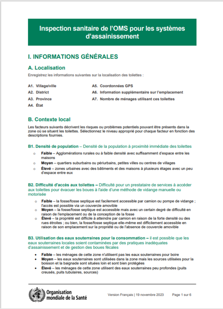 Les inspections sanitaires sont de courtes checklists d'observation standardisées qui peuvent être adaptées et utilisées par les intervenants pour évaluer les facteurs de risques dans les installations d'assainissement ou à proximité et identifier les actions appropriées pour sauvegarder la santé publique.