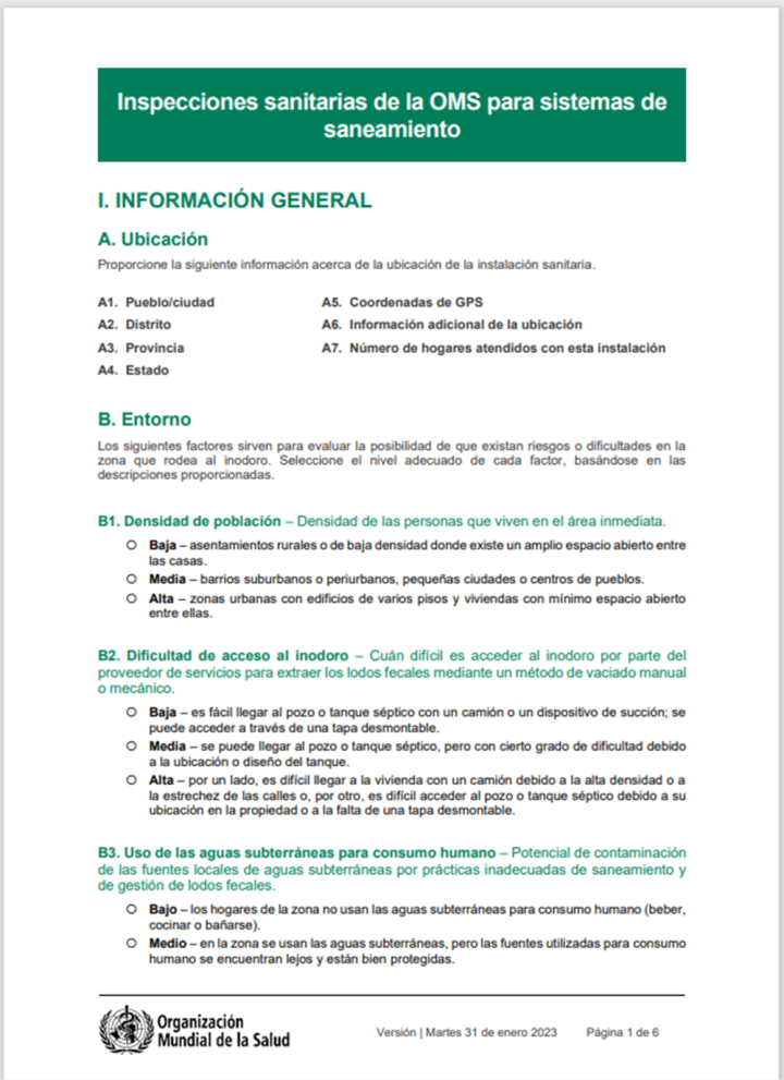 Las inspecciones sanitarias son listas de verificación de observación breves y estandarizadas que las partes interesadas pueden adaptar y utilizar para evaluar los factores de riesgo en las instalaciones de saneamiento o cerca de ellas e identificar acciones apropiadas para salvaguardar la salud pública.