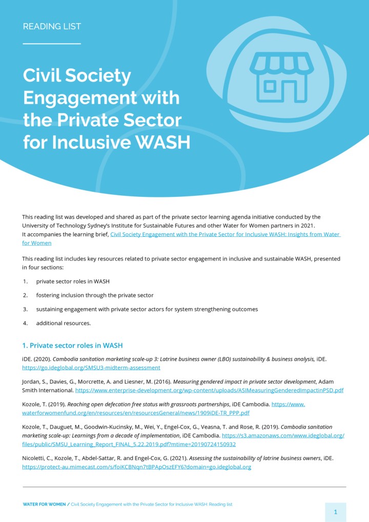 This reading list was developed and shared as part of the private sector learning agenda initiative conducted by the University of Technology Sydney’s Institute for Sustainable Futures and other Water for Women partners in 2021. It accompanies the learning brief, Civil Society Engagement with the Private Sector for Inclusive WASH: Insights from Water for Women.