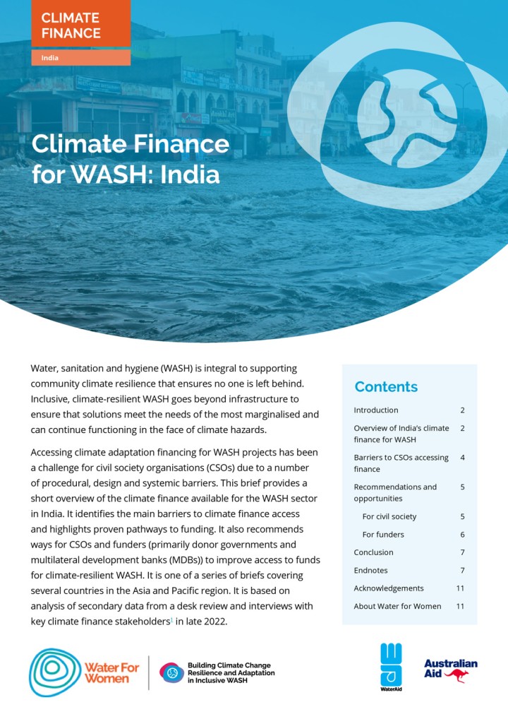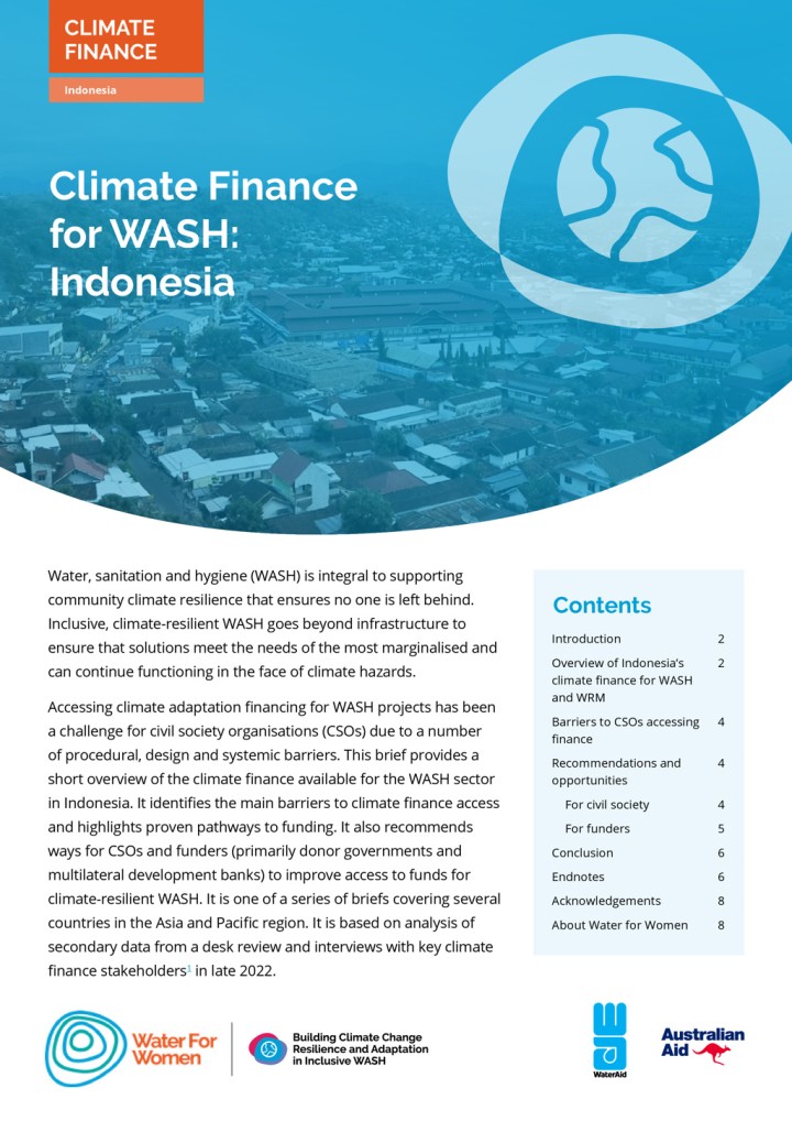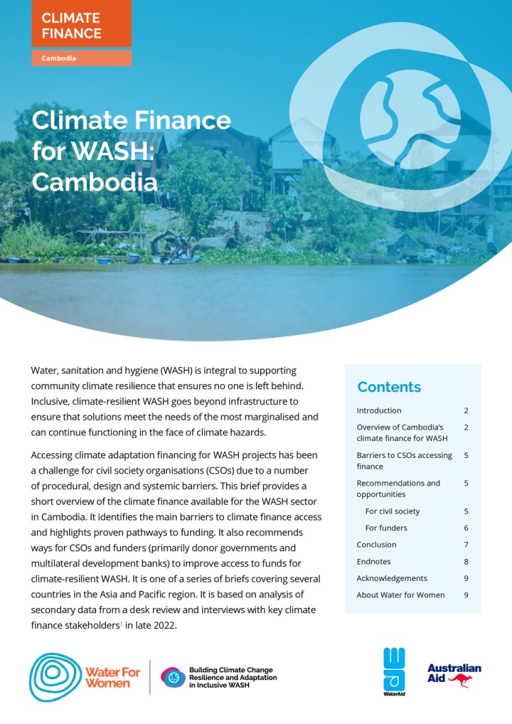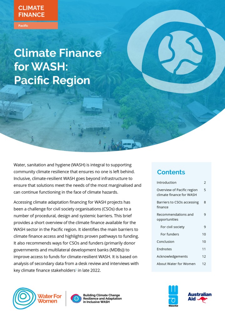 Accessing climate adaptation financing for WASH projects has been a challenge for civil society organisations due to a number of procedural, design and systemic barriers. To address this challenge, a consortium of Water for Women partners developed a series of briefs on climate finance for the WASH sector in Asia and the Pacific. The Pacific regional brief is available along with five country-specific briefs.