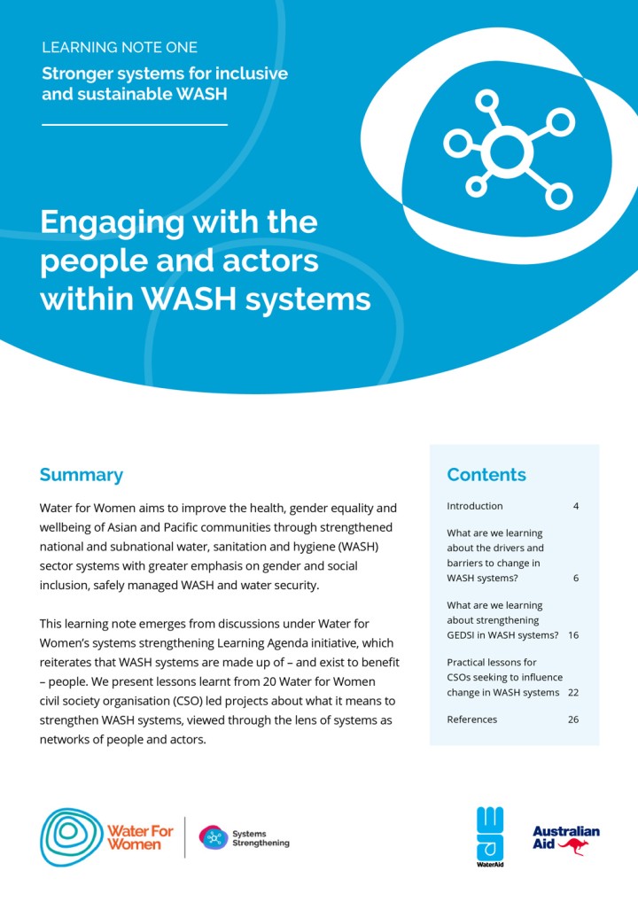 Water for Women aims to improve the health, gender equality and wellbeing of Asian and Pacific communities through strengthened national and subnational water, sanitation and hygiene (WASH) sector systems with greater emphasis on gender and social inclusion, safely managed WASH and water security. This learning note emerges from discussions under Water for Women’s systems strengthening Learning Agenda initiative, which reiterates that WASH systems are made […]