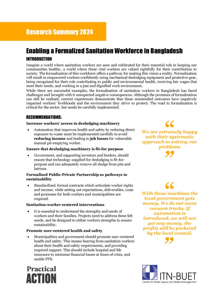 Imagine a world where sanitation workers are seen and celebrated for their essential role in keeping our communities healthy, a world where these vital workers are valued rightfully for their contribution to society. The formalization of this workforce offers a pathway for making this vision a reality. Formalization will result in empowered workers confidently using mechanical desludging equipment and protective gear, being recognized for their […]