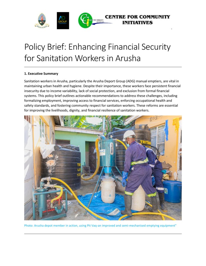 Sanitation workers in Arusha, particularly the Arusha Deport Group (ADG) manual emptiers, are vital in maintaining urban health and hygiene. Despite their importance, these workers face persistent financial insecurity due to income variability, lack of social protection, and exclusion from formal financial systems. This policy brief outlines actionable recommendations to address these challenges, including formalizing employment, improving access to financial services, enforcing occupational health and […]