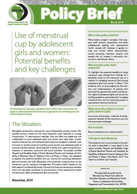 Use of menstrual cup by adolescent girls and women: Potential benefits and key challenges Policy Brief No. 22 APHRC (2010)