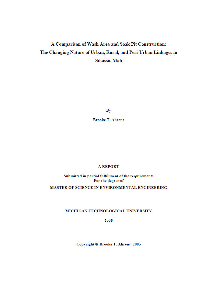 Ahrens, B. (2005). A Comparison of Wash Area and Soak Pit Construction The Changing Nature of Urban, Rural, and Peri-Urban Linkages in Sikasso, Mali Peace Corps, US.