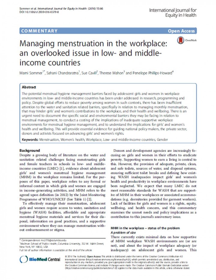 The potential menstrual hygiene management barriers faced by adolescent girls and women in workplace environments in low- and middle-income countries has been under addressed in research, programming and policy. Despite global efforts to reduce poverty among women in such contexts, there has been insufficient attention to the water and sanitation related barriers, specifically in relation to managing monthly menstruation, that may hinder girls’ and women’s […]